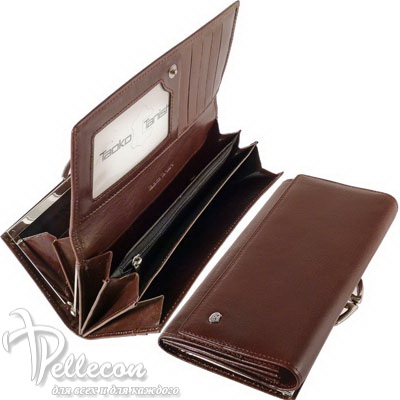 Натуральная кожа. Размер 18,5х9 см. Закрывается клапаном на кнопке. Внутри: три отделения для купюр, одно отделение на молнии, один потайной карман, восемь кармашков для пластиковых карт, один потайной карман на клапане, отделение для пропуска с прозрачным окошком, снаружи, на оборотной стороне: два отделения для монет под рамочным замком.