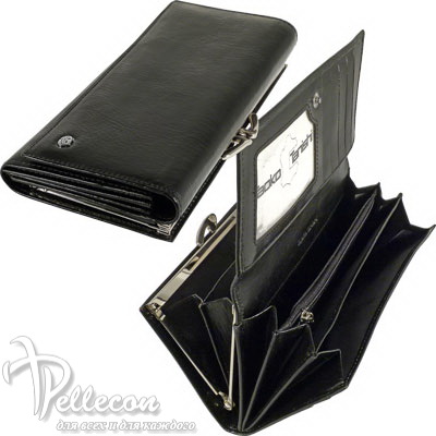Натуральная кожа. Размер 18,5х9 см. Закрывается клапаном на кнопке. Внутри: три отделения для купюр, одно отделение на молнии, один потайной карман, восемь кармашков для пластиковых карт, один потайной карман на клапане, отделение для пропуска с прозрачным окошком, снаружи, на оборотной стороне: два отделения для монет под рамочным замком.