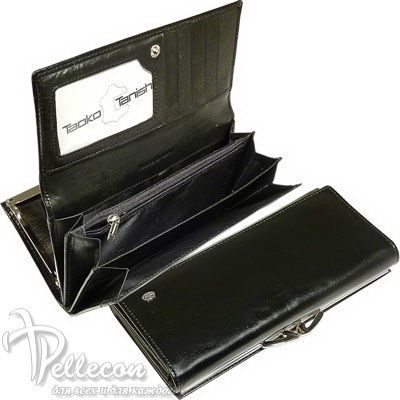 Натуральная кожа. Размер 18,5х9 см. Закрывается клапаном на кнопке. Внутри: три отделения для купюр, одно отделение на молнии, один потайной карман, восемь кармашков для пластиковых карт, один потайной карман на клапане, отделение для пропуска с прозрачным окошком, снаружи, на оборотной стороне: два отделения для монет под рамочным замком.