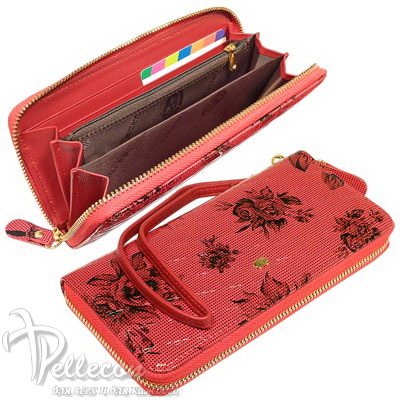 Натуральная кожа. Размер: 19х10 см. Закрывается на молнию. Внутри: 3 отделения для купюр, 1 отделение на молнии для монет, 8 кармашков для пластиковых карт, 2 потайных отделения. Снаружи: съемная ручка для ношения на руке.
