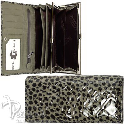 Натуральная кожа. Размер 18,5х9,5 см. Закрывается клапаном на кнопке. Внутри: три отделения для купюр, одно отделение на молнии, семь кармашков для пластиковых карт, один потайной карман и два прозрачных кармашка для пропуска и фотографии на клапане, два отделения для монет под рамочным замком.