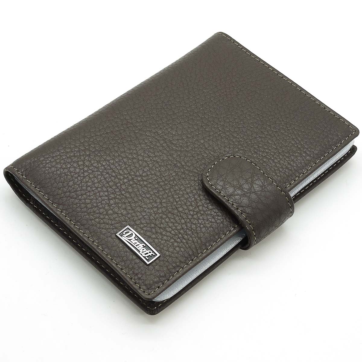 Натуральная кожа. Цвет: темно-коричневый. Размер (ШхВ): 9,5х13 см. Закрывается клапаном на кнопке. Внутри - прозрачное и кожаное поля, на боковой стенке четыре кармашка для пластиковых карт, съемный ПВХ вкладыш для автодокументов.