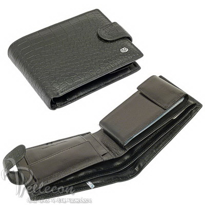 Натуральная кожа. Размер 11,5Х9 см.. Внутри: три отделения для купюр (одно с молниевым замком), десять прозрачных листов для визиток и прозрачный карман закрывает створка с кнопкой, два боковых кармана, монетник с кнопкой.