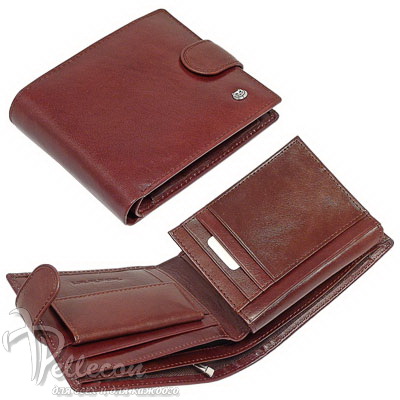Натуральная кожа. Размер: 11,5х9,3 см. Внутри: три отделения для купюр (одно с молнией), шесть кармашков для пластиковых карт, прозрачный карман на створке с внутренней стороны, три боковых кармана (один с рпозрачным полем), монетник с кнопкой.