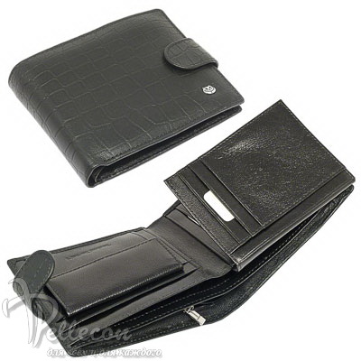 Натуральная кожа. Размер: 11,5х9,3 см. Внутри: три отделения для купюр (одно с молнией), шесть кармашков для пластиковых карт, прозрачный карман на створке с внутренней стороны, три боковых кармана (один с рпозрачным полем), монетник с кнопкой.