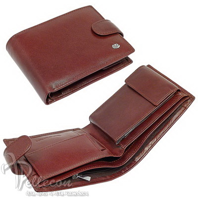 Натуральная кожа. Размер 11,5Х9 см.. Внутри: три отделения для купюр (одно с молниевым замком), десять прозрачных листов для визиток и прозрачный карман закрывает створка с кнопкой, два боковых кармана, монетник с кнопкой.